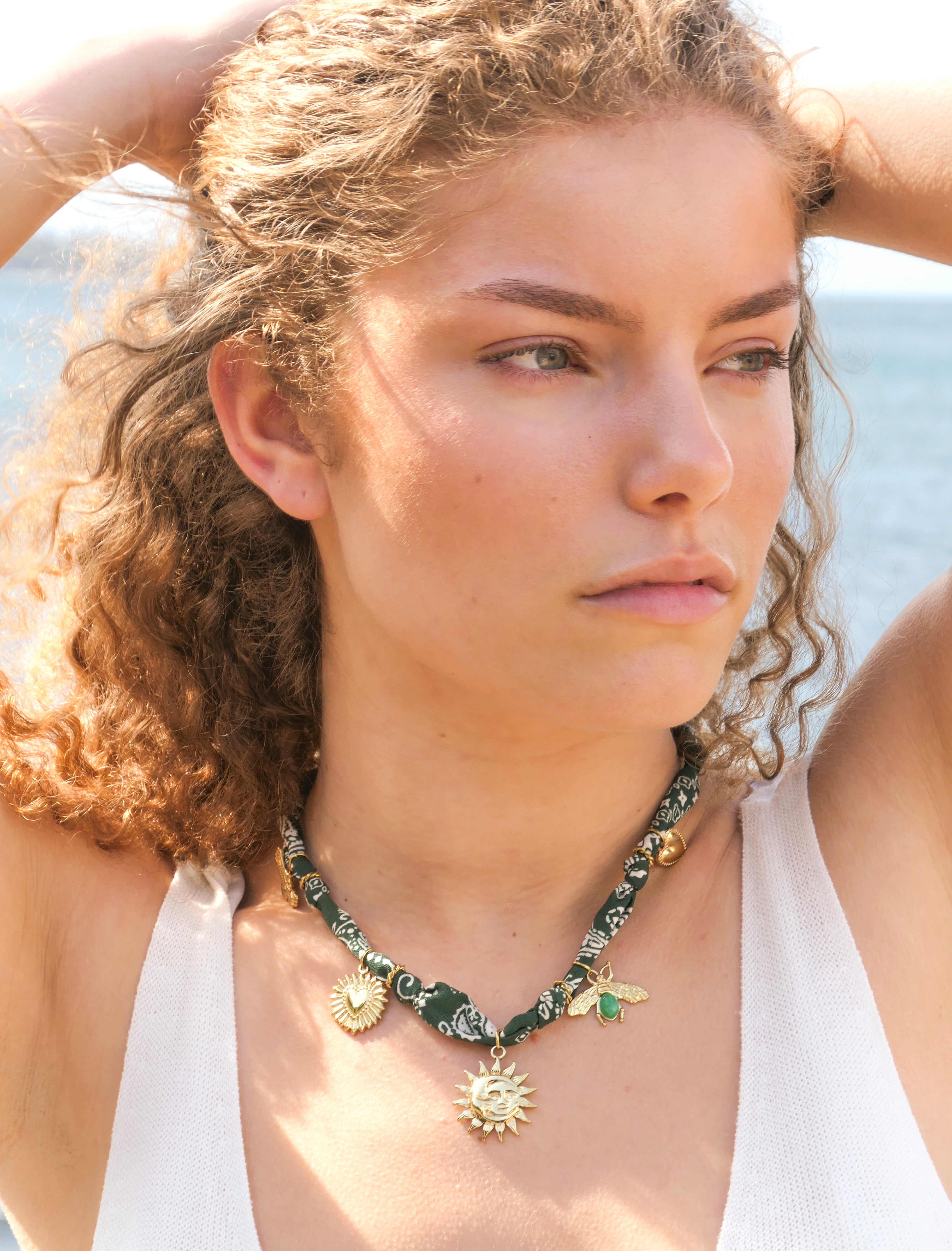 Le Soleil Vert Necklace – Unique Fabric and Golden Charms