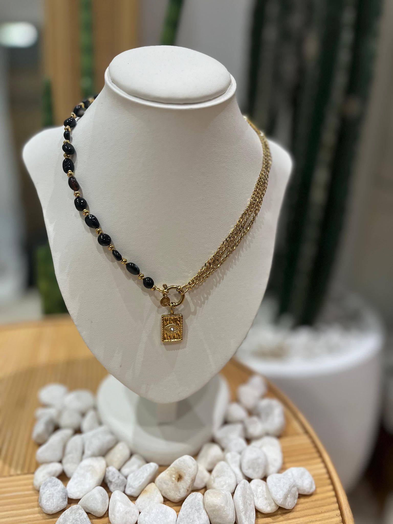 Perfect for pairing with both casual and formal looks, this necklace blends the earthy allure of natural stones with the timeless appeal of gold chains.