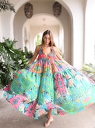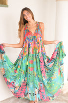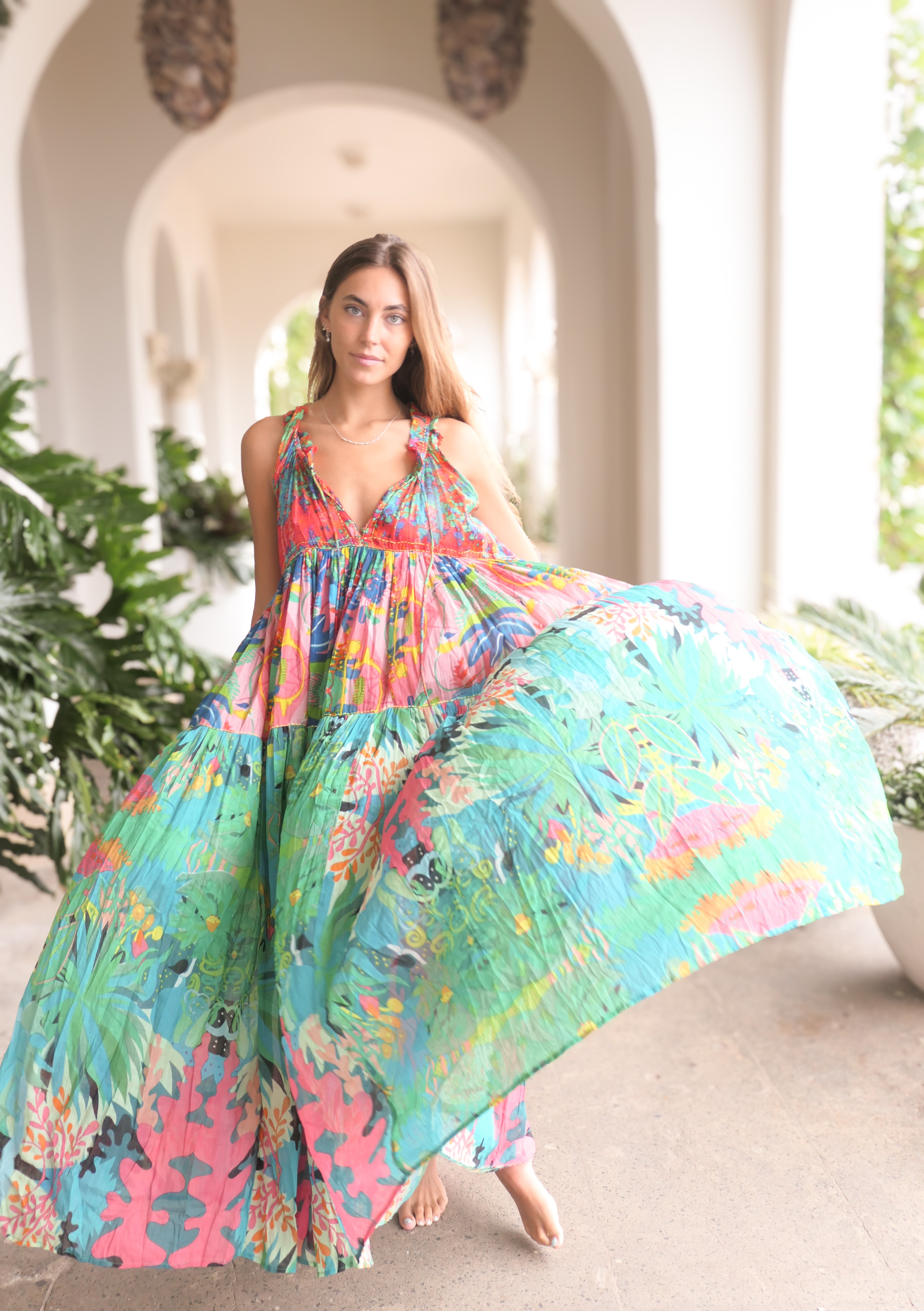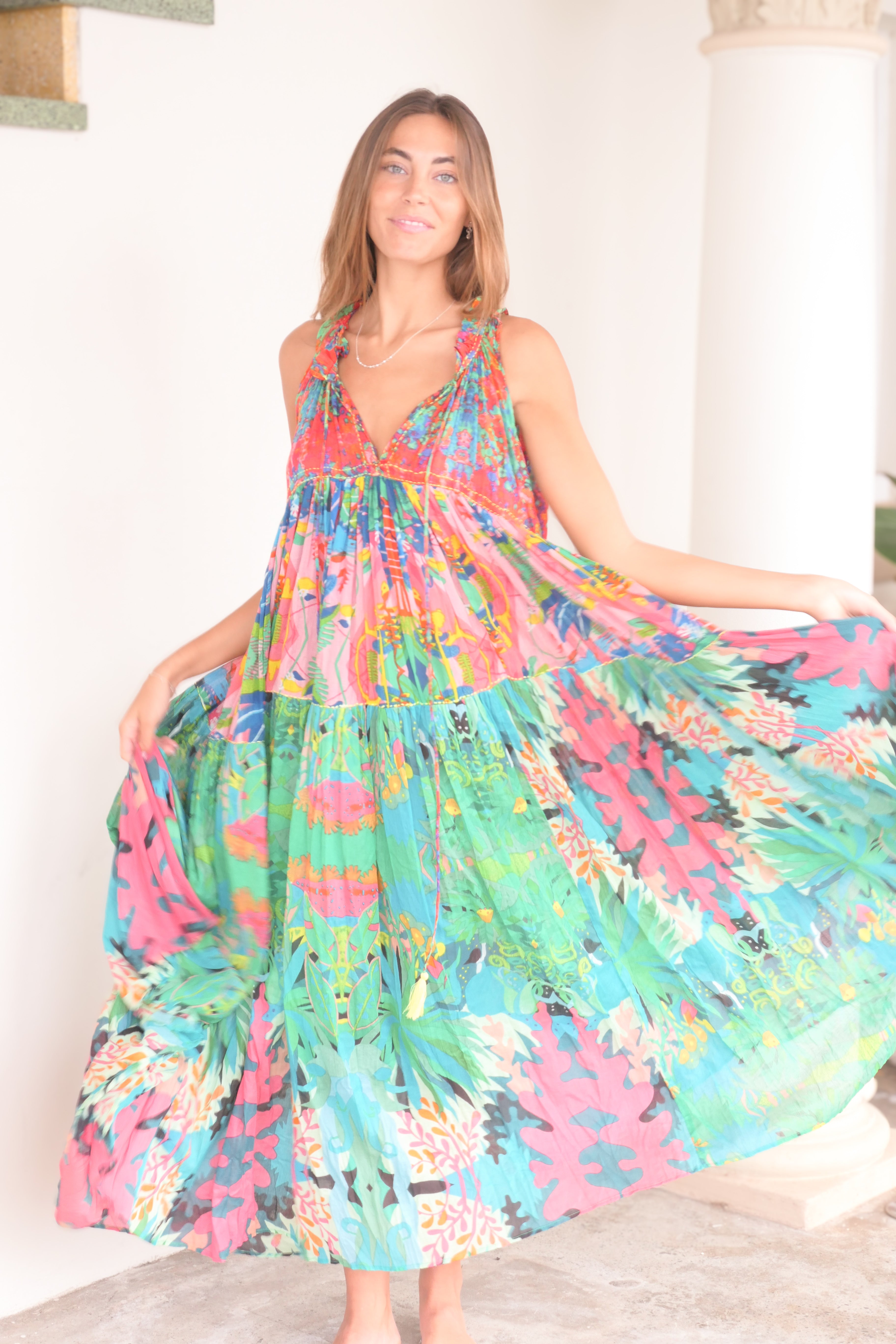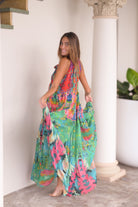 Embrace effortless bohemian elegance with the Panama Dress in Tropical Print, a vibrant statement piece that captures the magic of summer. Crafted from 100% breathable cotton, this dress features an explosion of lush greens, fiery reds, ocean blues, and coral pinks in a flowing silhouette that’s as dreamy as it is comfortable. Whether you're dancing barefoot by the beach, exploring sun-soaked streets, or simply soaking up good vibes, this dress brings colour and freedom to your every move.